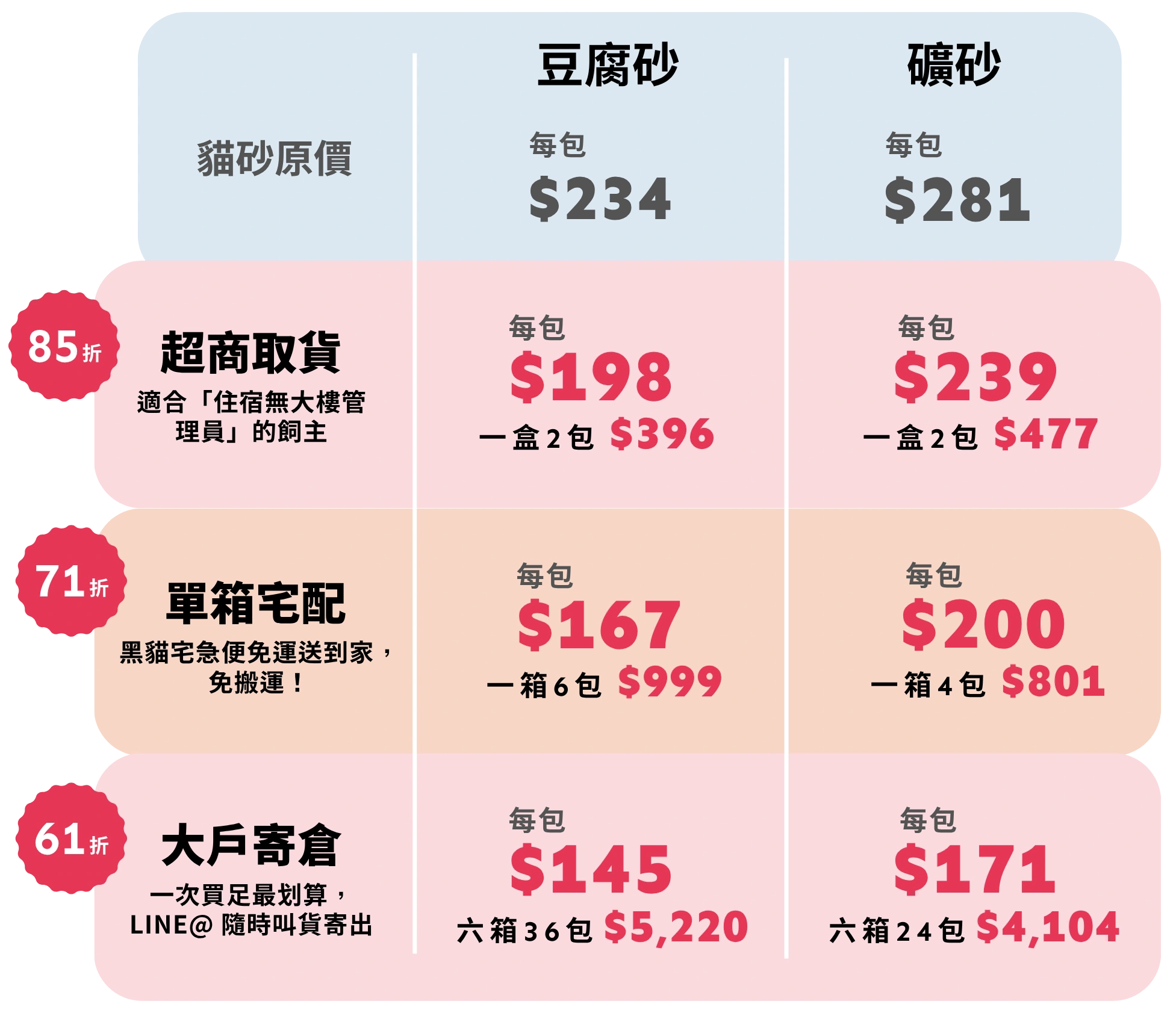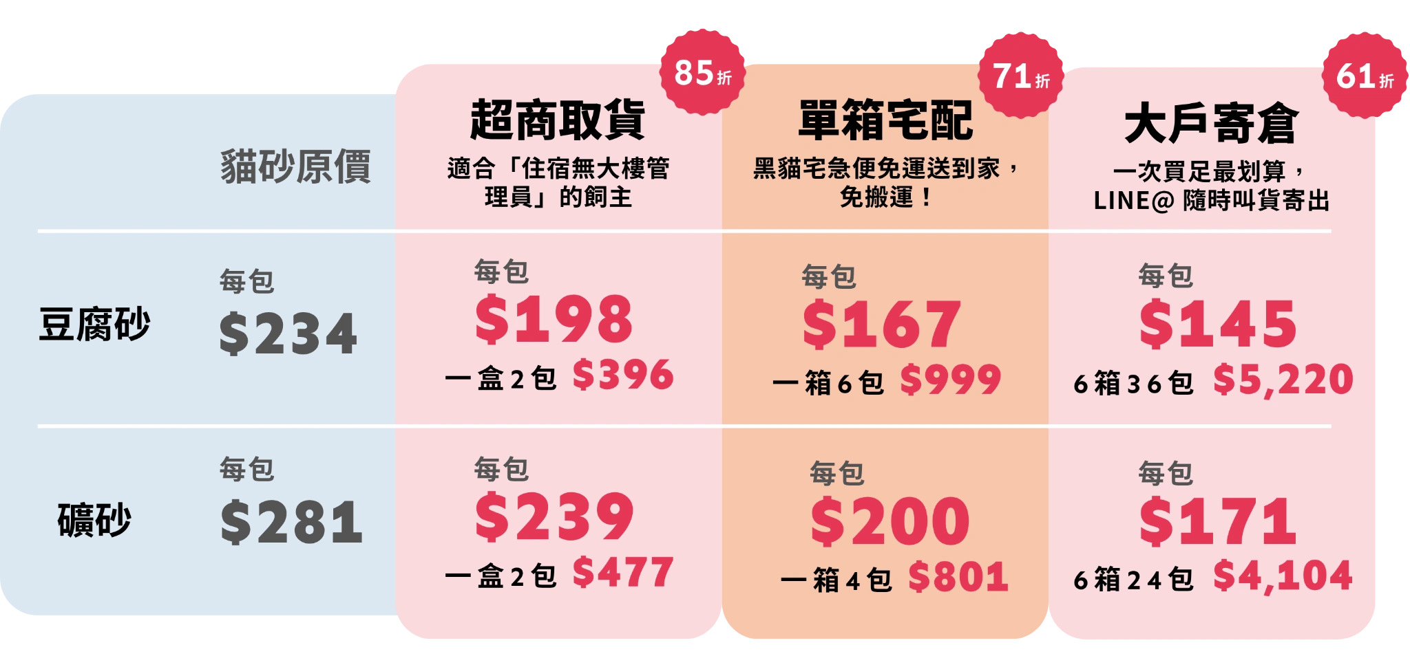- 如何訂購:使用「愛貓一生」的大戶寄倉服務,訂購後首箱將於隔日出貨(國定假日及週日除外),其餘箱數請透過 LINE@ 聯繫客服出貨。不論您訂的是豆腐砂還是礦砂,都能享有快速且安心的配送體驗。