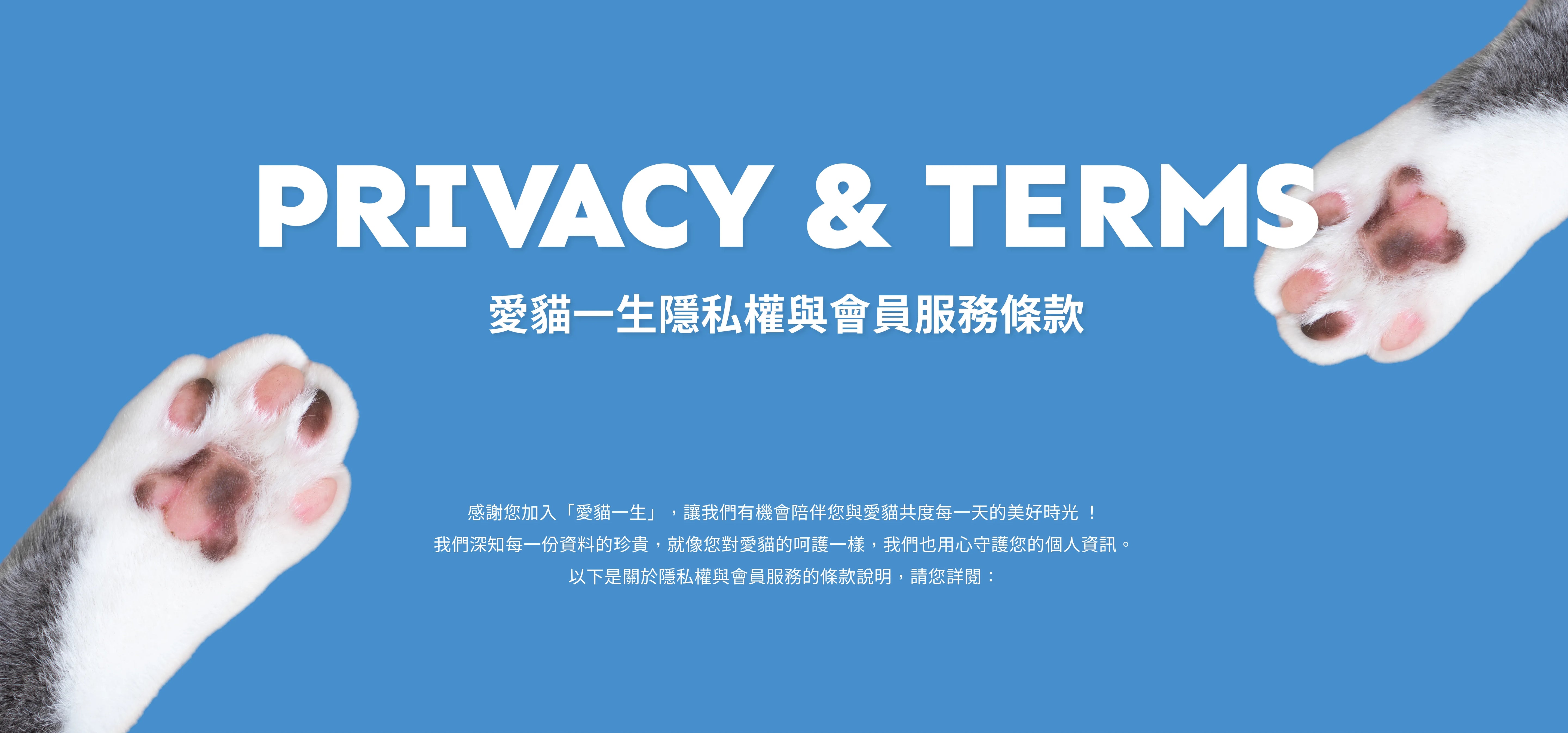 - 隱私適用範圍:本政策適用於您使用「愛貓一生」網站與會員服務時所提供的任何個人資料,並說明我們如何保護及管理這些資料。