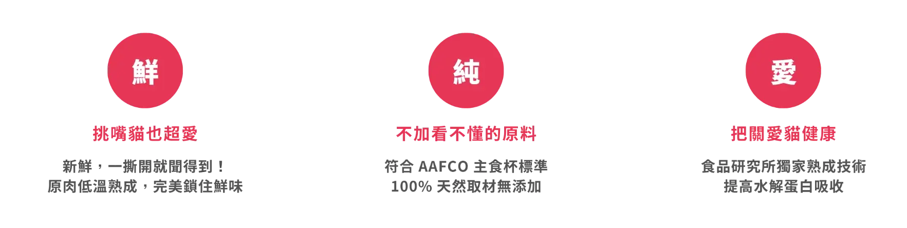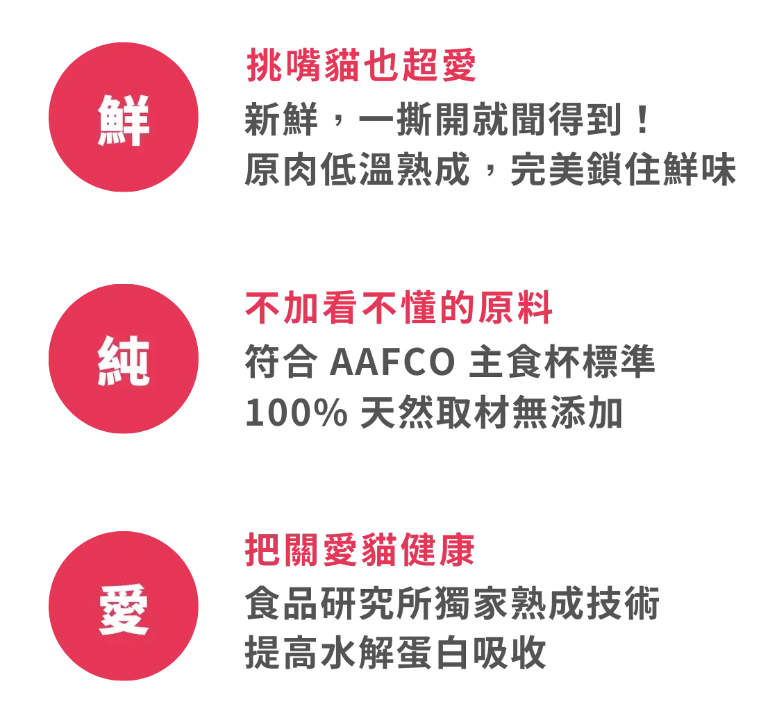我們來自食品專業背景,用製作人類食品及 AAFCO 標準製作貓咪濕食主食杯,不添加看不懂的化學成分,讓貓咪吃得安心,你也看得懂。