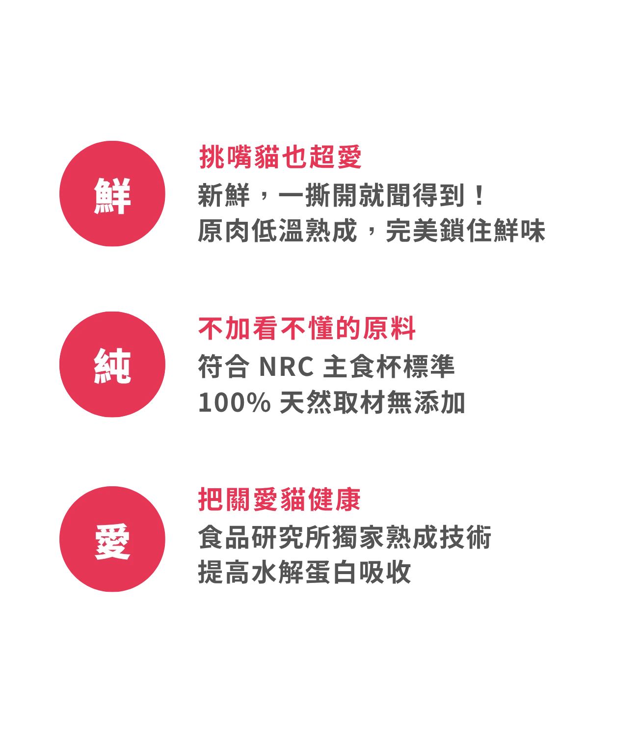 我們來自食品專業背景,用製作人類食品及 NRC 標準製作貓咪濕食主食杯,不添加看不懂的化學成分,讓貓咪吃得安心,你也看得懂。 - ✅ 台灣自建工廠,D2C工廠直送